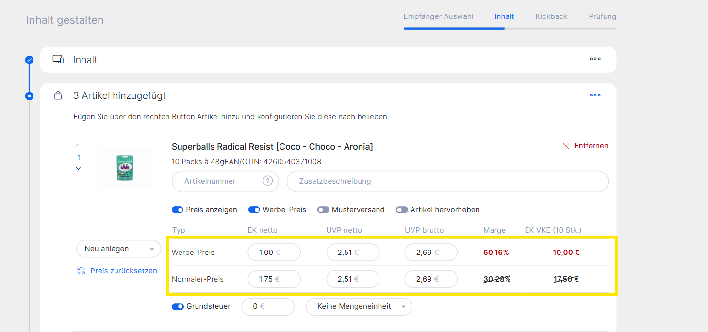 Über die Einstellungen lassen sich Preise für einzelne Artikel abwählen, sodass Sie individuell pro Empfängergruppe entscheiden können.