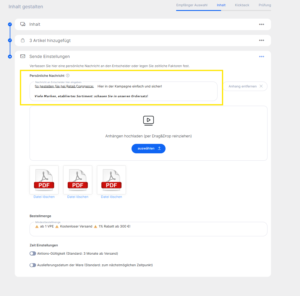 Bei der Gestaltung Ihrer Aktion haben Sie die Möglichkeit, eine persönliche Nachricht sowie Anhänge hinzuzufügen. (Abb. 1)
