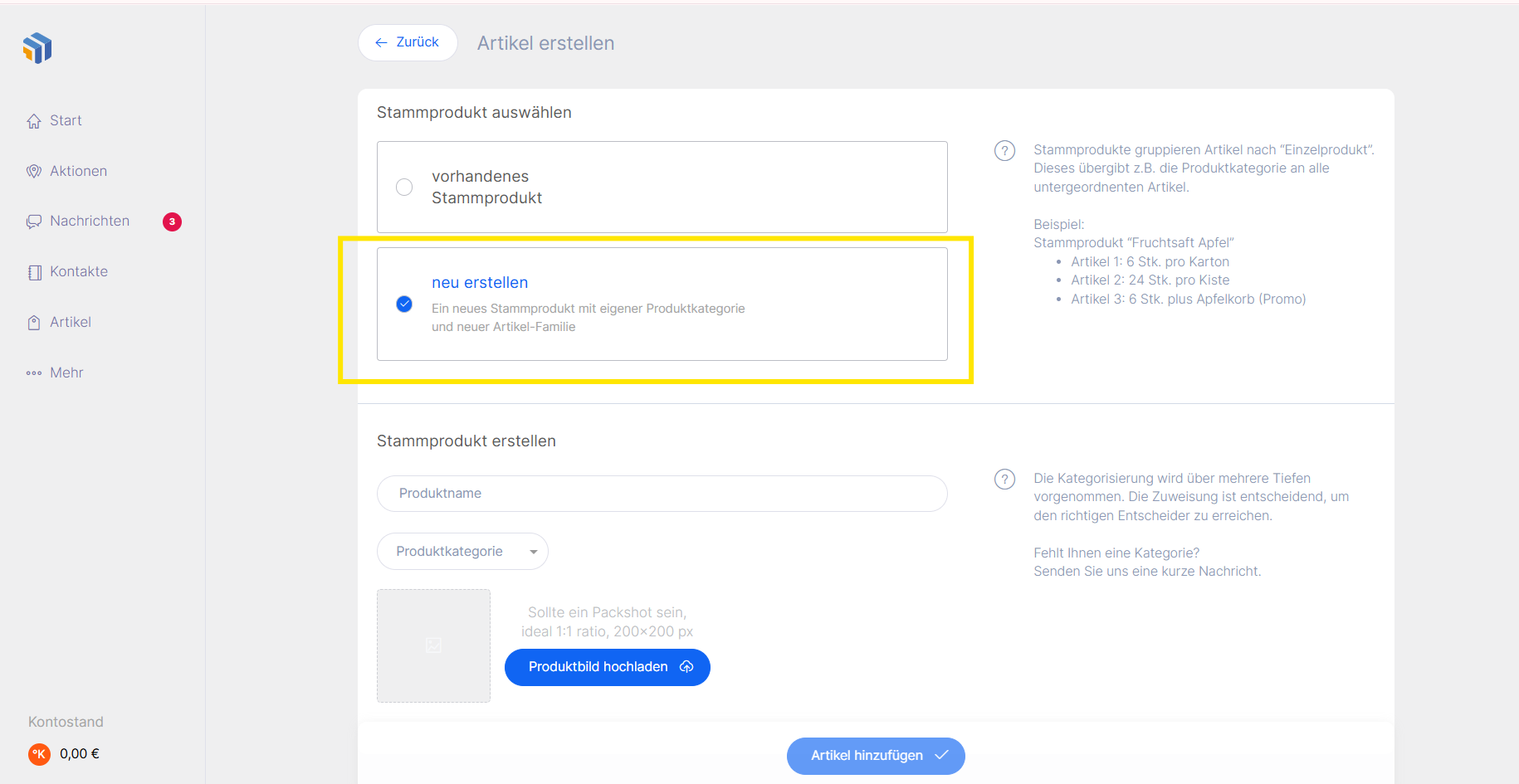 Ordnen Sie das Stammprodukt einer passenden Produktkategorie zu.