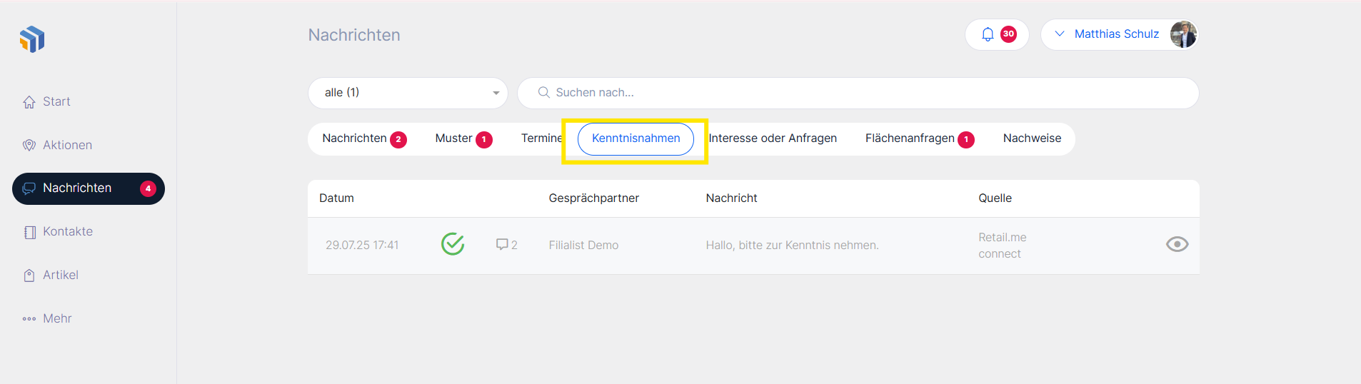 Unter Nachrichten → Kenntnisnahmen finden Sie Mitteilungen von Händlern, mit denen Sie bereits vernetzt sind.