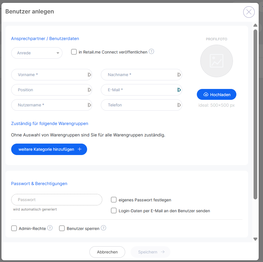 Zusätzlich können Sie Admin-Rechte vergeben, sodass dieser Benutzer selbst weitere Benutzer anlegen darf.