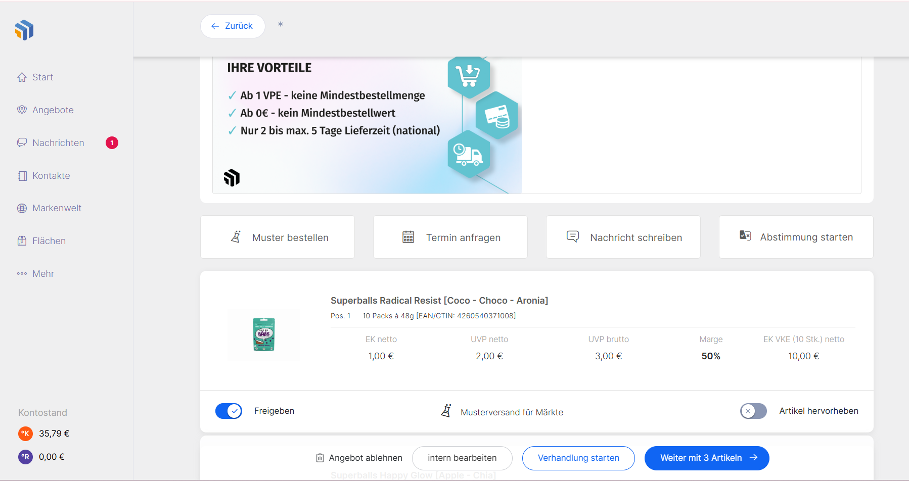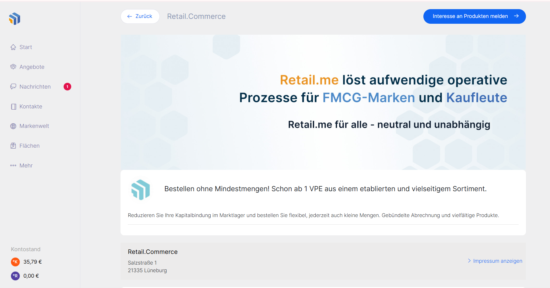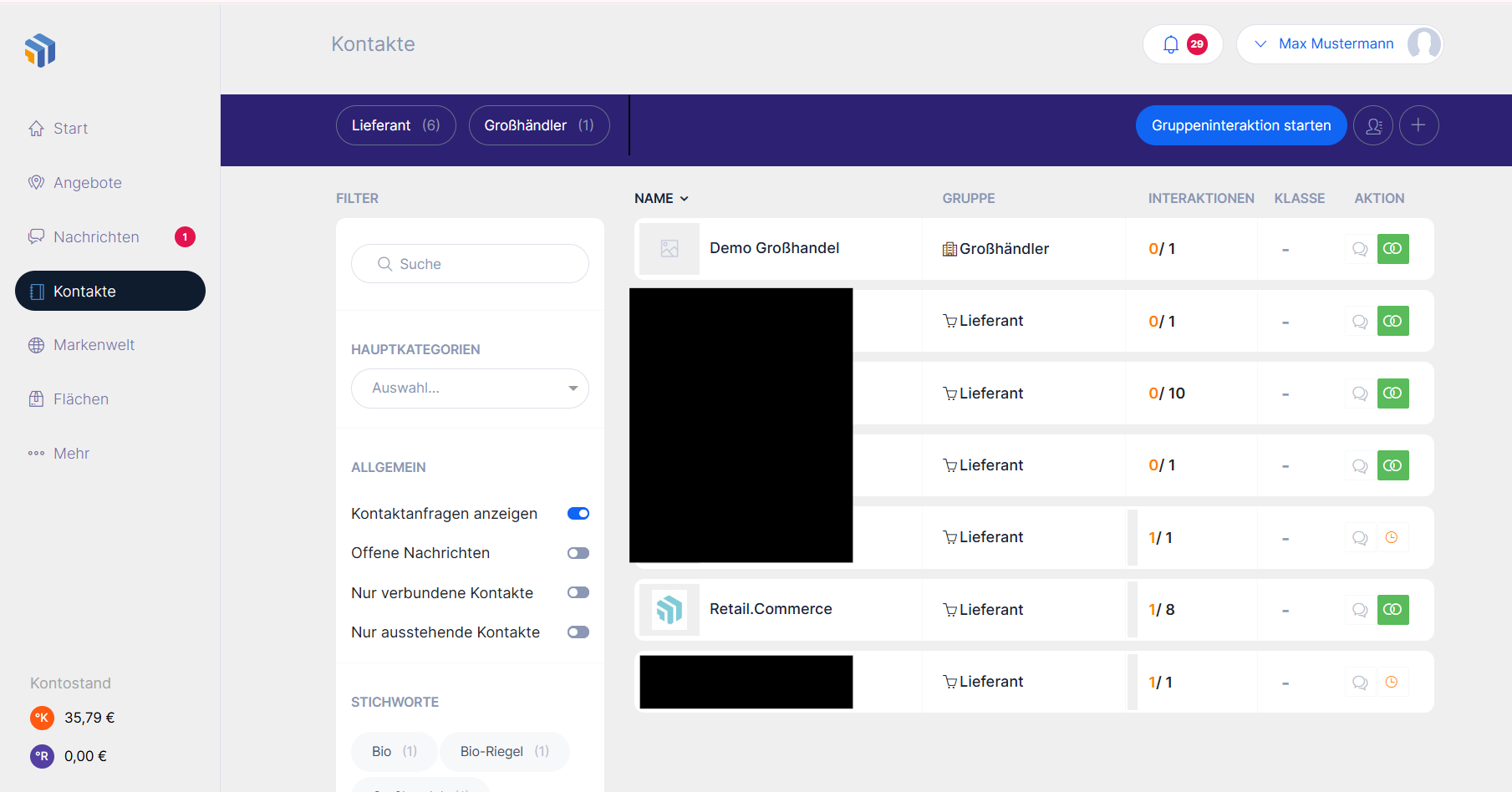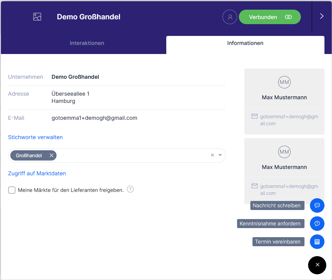 Als Händler haben Sie mehrere Möglichkeiten, über Retail.me Kontakt zu Lieferanten aufzunehmen. Sie können das gesamte veröffentlichte Netzwerk nutzen – entweder über Angebote, die Markenwelt oder den Bereich Kontakte.