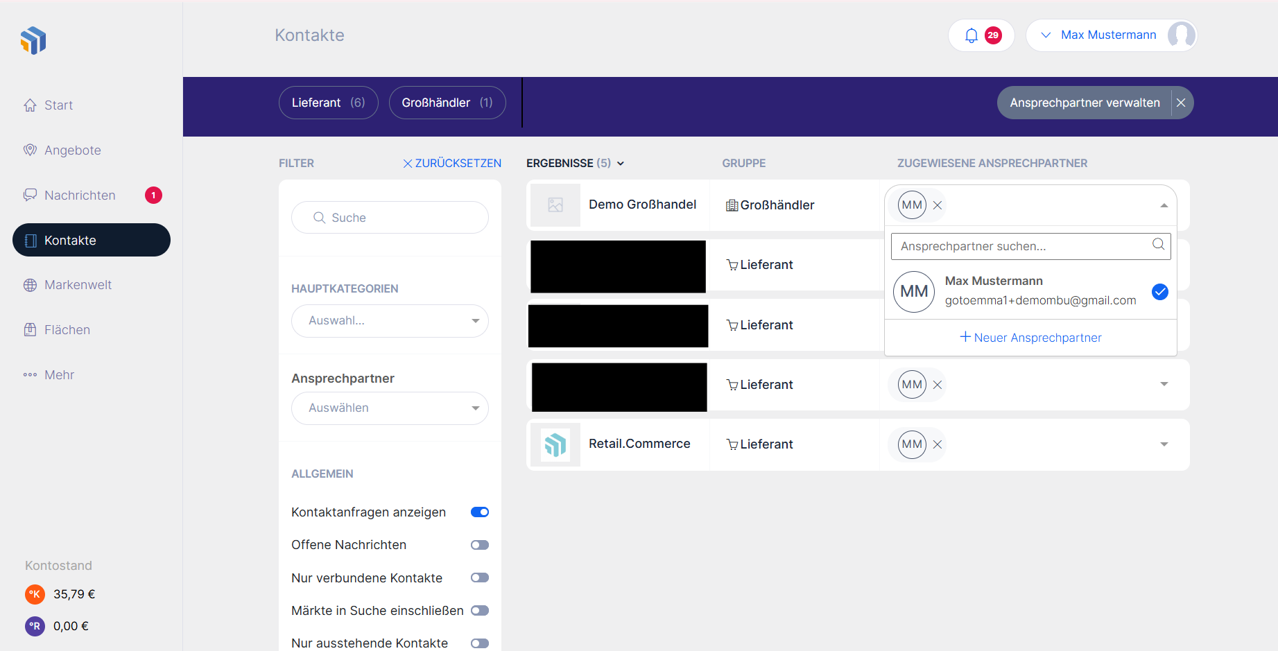 Über den Bereich Kontakte können Sie Ihren Lieferanten die passenden Ansprechpartner in Ihrem Markt zuweisen.