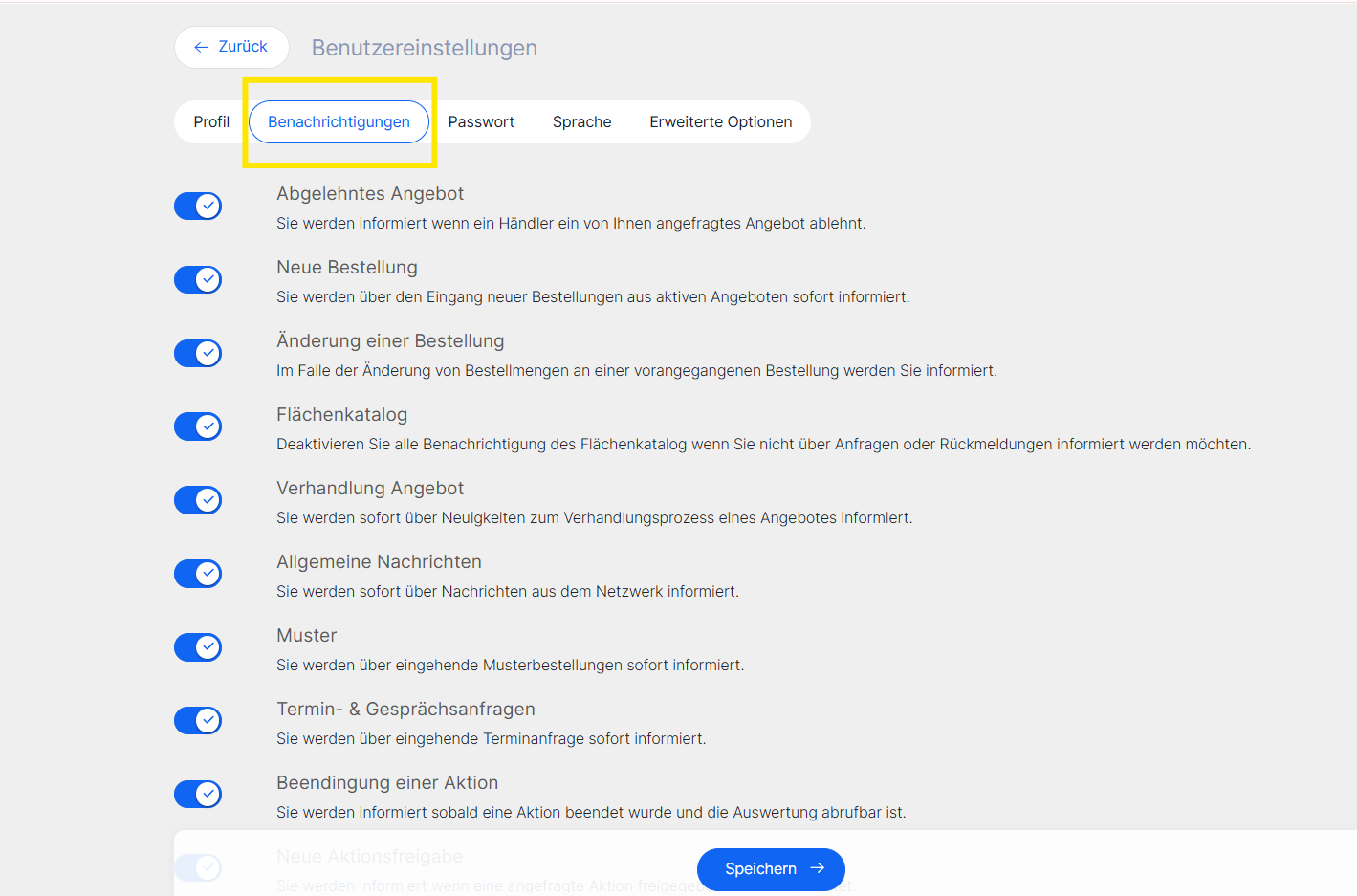 Unter Benutzereinstellungen → Benachrichtigungen wählen Sie aus, über welche Vorgänge Sie per E-Mail informiert werden möchten.