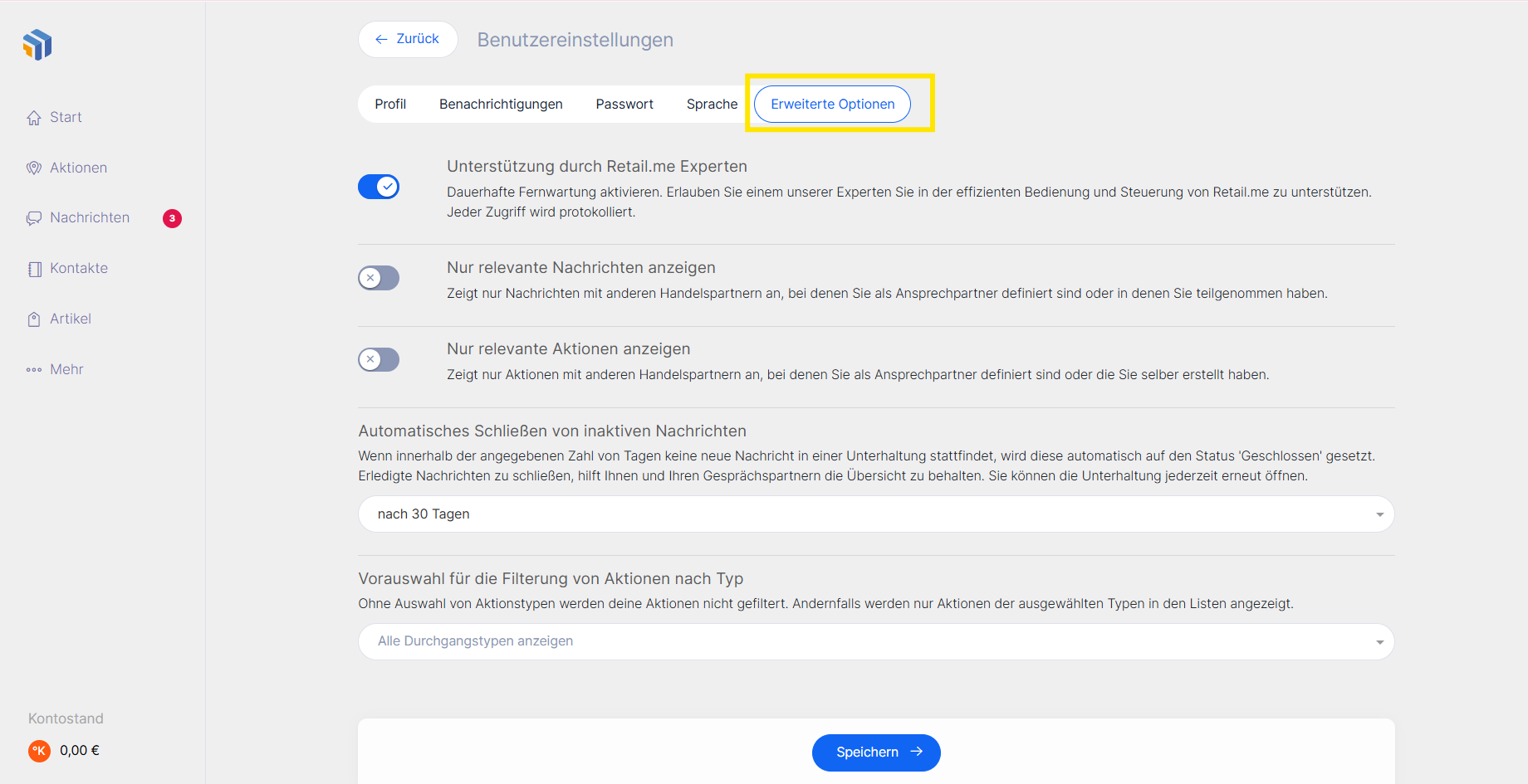 Unter Benutzereinstellungen → Erweiterte Optionen haben Sie die Möglichkeit, dem Retail.me Experten (Customer Success Team) eine dauerhafte Fernwartung zu Ihrem Account zu erlauben. Diese Einstellung kann jederzeit wieder deaktiviert werden. (Abb. 5)