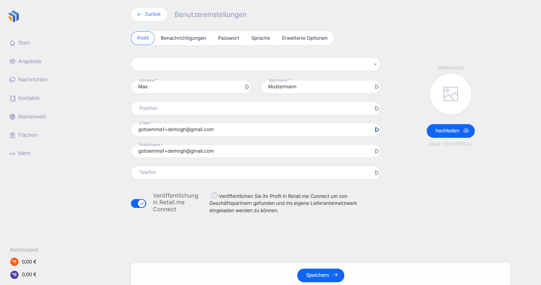 Mit dem Regler für „Veröffentlichung in Retail.me Connect“ entscheiden Sie, ob Sie im Netzwerk als Kontakt Ihres Unternehmens gefunden werden sollen.